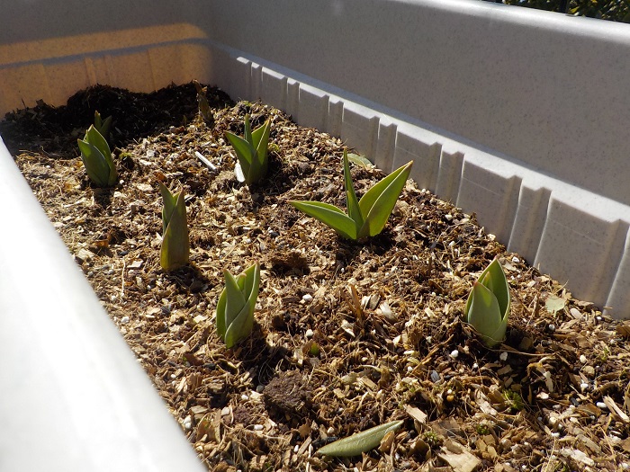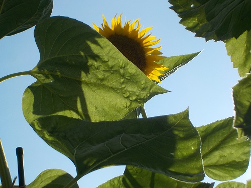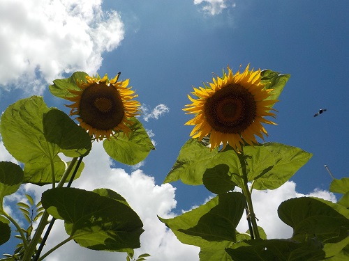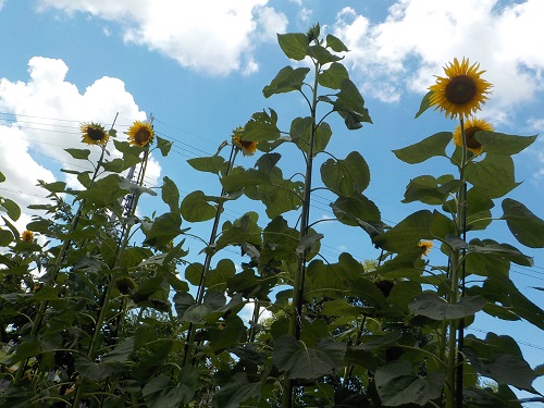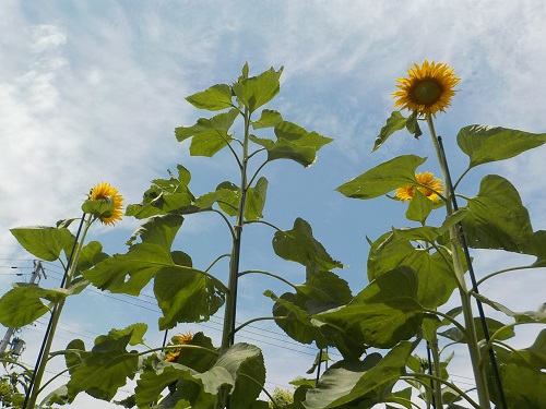 ヒマワリ(小さいサイズ)は、お日様に向かって生長を競い合っているようです。