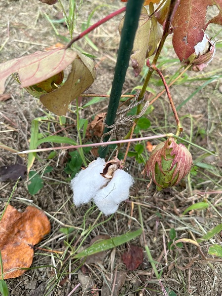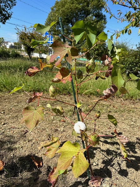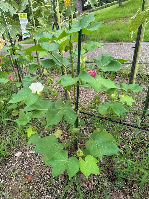 お隣の綿花も少しずつ花をつけ始めました。花の寿命は1~2日と短く白く咲いた花の色が変わるんです!!