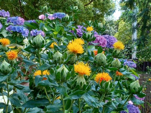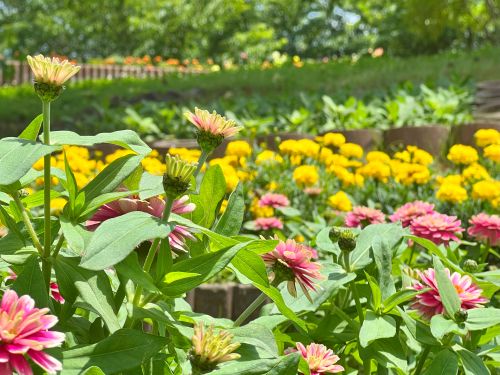 夏に強いマリーゴールドが、黄色やオレンジ色の花をたくさんつけていて、濃い緑色の葉とのコントラストが見事です。