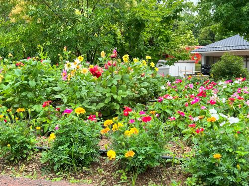 ダリアは、暖色系の様々な色の花が正面を向いて咲いていて、まるで花たちで会話をしているかのようです。