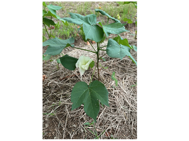 お隣の綿花も少しずつ花をつけ始めました。花の寿命は1~2日と短く白く咲いた花の色が変わるんです!!
